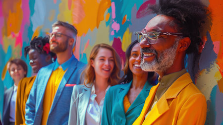 Joyful multicultural group of professionals stands against colorful mural image, ai generated. Colleagues dressed in stylish outfits photography scene. Vibrant work culture concept photorealistic