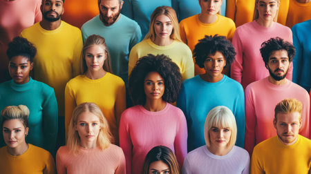 A vibrant gathering of individuals dressed in brightly colored sweaters, showcasing diverse backgrounds and styles while standing closely together in a well-lit indoor setting.