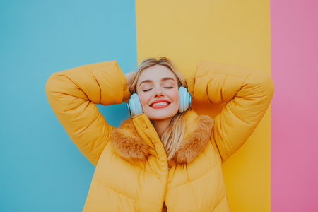 Beautiful woman in warm outerwear enjoying music on wireless headphones in cold weather