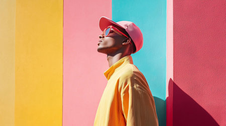 A vibrant portrait of a man wearing a red cap and yellow jacket, styled against a colorful geometric wall for a bold look.