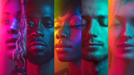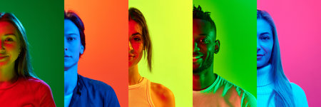 Collage of portraits of multiethnic people in neon light.
