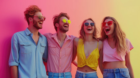 A diverse group of friends in colorful attire smiles cheerfully, conveying happiness and unity in front of a vibrant background.