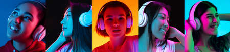 Portraits of group of people on multicolored background in neon light, collage.