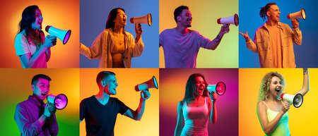 Collage of portraits of young people with microphones isolated over multicolored backgrounds in neon light.