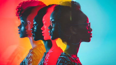 A group of diverse young women in casual clothing and glasses, smiling against a vibrant, colorful background. Celebrating diversity, friendship, and happiness.