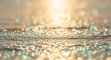 Golden sunlight creates a bokeh effect on the gently rippling surface of the ocean, casting a warm, shimmering glow.