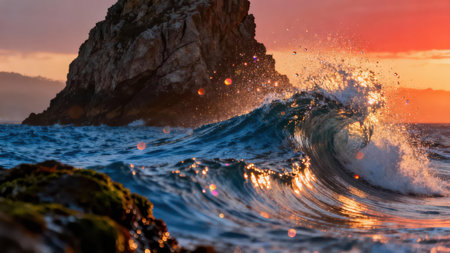 Waves crash and shimmer with sunset light, creating a magical atmosphere on the ocean.