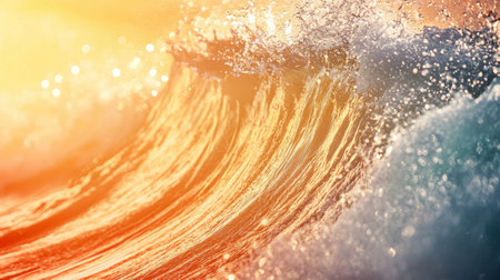 Close-up of a powerful ocean wave cresting and breaking at sunset or sunrise. Golden light illuminates the water's movement and intricate patterns, showcasing nature's beauty and dynamic energy.