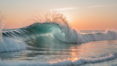 Close-up shot of a turquoise ocean wave curling as it crashes, reflecting golden sunset light. Spray and foam create a dynamic scene under a pastel sky.