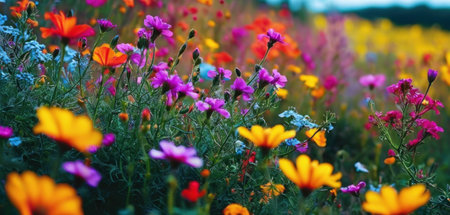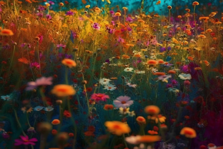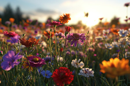 Vibrant wildflowers bloom in a colorful field at sunset enhancing natural beauty