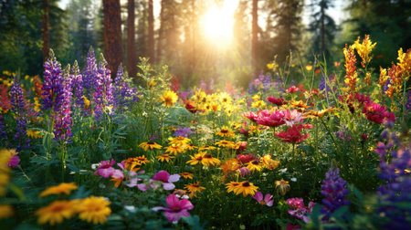 A diverse array of colorful wildflowers flourishes in a sunlit forest. The composition emphasizes rich textures and a warm color palette. Brilliant sunlight streams through the trees, enhancing the natural setting. This image could be suitable for a variety of editorial or commercial purposes.