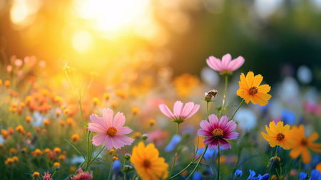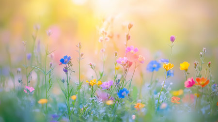 A wildflower meadow spring flower colorful nature field blossom garden sunrise wildflower meadow with colorful blossom flower field nature garden beauty in soft sunrise light