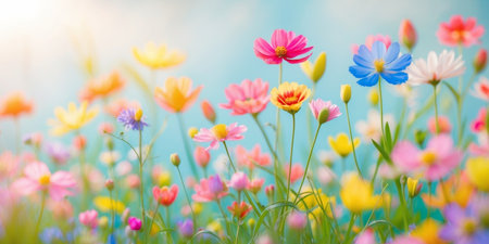 Bright wildflowers of various colors sway gently in the spring breeze against a serene blue backdrop, creating a lively and cheerful atmosphere.