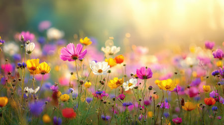 Vibrant wildflowers dance in sunlight, showcasing a variety of colors in a peaceful meadow. This beautiful natural scene captures the essence of spring and renewal.