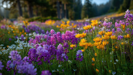 A stunning array of wildflowers blooms in a meadow during springtime. Various colors like purple, yellow, and white create a vibrant landscape amidst tall trees and gentle sunlight.