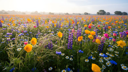 Vibrant wildflowers bloom in a sunlit meadow during springtime, showcasing natures beauty and colors
