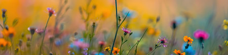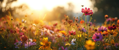 banner field with wildflowers, petals illuminated by the sun, blossom, concept spring, summer, natural background