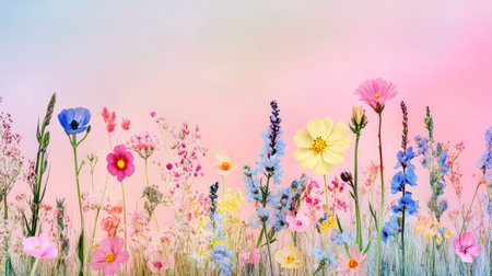 A beautiful composition of wildflowers in various colors, set against a soft pastel background, capturing the essence of spring and nature.