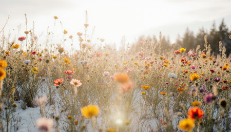 A breathtaking view of a vibrant wildflower field at dusk, illuminated by soft sunlight, showcasing a spectrum of warm hues and natural beauty. Perfect for serene environments.