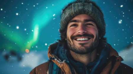 Man with Joyful Expression Against Northern Lights