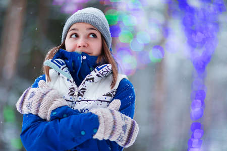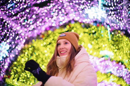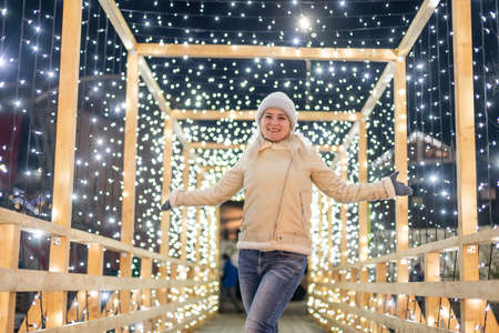 Young smiling happy girl in Christmas decorated with holiday lights. New Year's Eve, festive atmosphere. Moscow, Tverskoy Boulevard. Spending winter time outdoors. Warm clothes, knitted hat, mittens