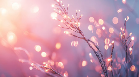 This enchanting image captures delicate twinkling lights perched on branches, set against a soft pink and purple backdrop, creating a dreamy atmosphere.