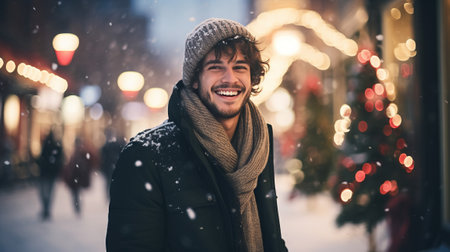 Portrait of a smiling young man walking on the street during snowfall