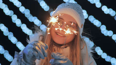 Young girl posing with sparklers against the background of New Years daisies.