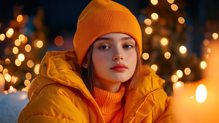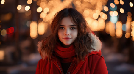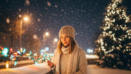 An enchanting young woman with curly hair in the evening, surrounded by the radiance of lights and a adorned Christmas tree. A night-time walk through the festive city on Christmas Eve