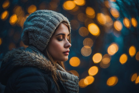 Portrait of a beautiful young woman in a winter hat and coat on a background of bokeh lights