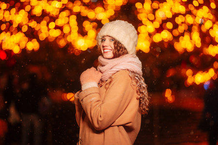 Smiling woman with garlands and holiday lights on festive Christmas fair. Lady wearing classic stylish winter knitted clothes.