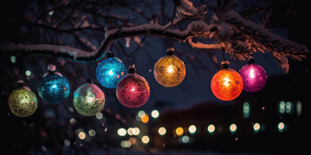 Colorful Christmas Balls on snowy tree branches in winter night. Christmas decoration. Background for Christmas and New Year Greeting card, postcard, invitation or banner design