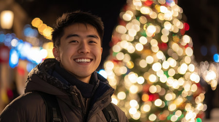 A man smiles in front of a Christmas tree at night