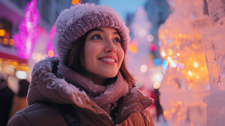 Smiling woman enjoying winter festivities while surrounded by colorful lights and ice sculptures in a snowy city. Generative AI