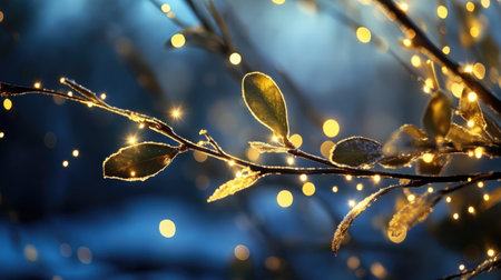 An enchanting winter scene featuring a delicate branch adorned with sparkling lights and frosty leaves, creating a magical and serene atmosphere.