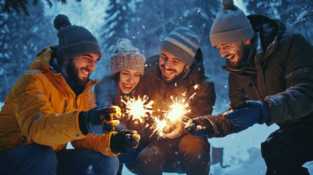 Engineers enjoying a festive winter celebration with sparklers and snow in the background