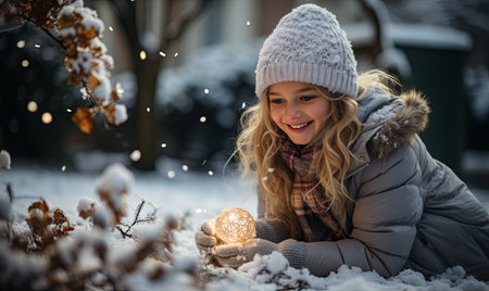 A young girl joyfully playing with a snow globe in the snow-covered outdoors.
