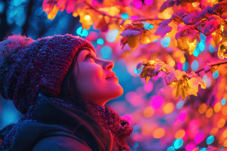 A woman gazes upward with joy, enjoying vibrant lights glowing on snow-covered branches at twilight.