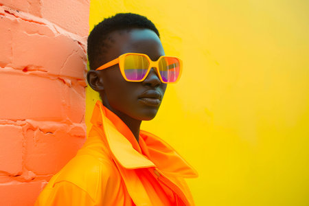 Stylish young woman wearing bright glasses and fashionable outerwear in vibrant colors, posing against a colorful urban backdrop. A unique blend of modern style and artistic expression is displayed.
