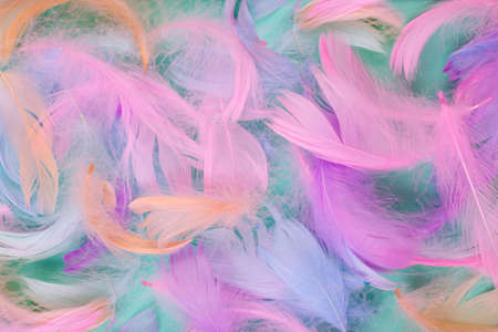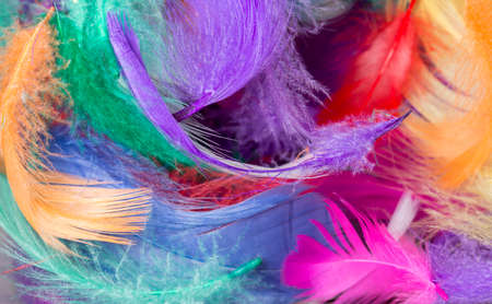 Close up to bright colorful feathers background. Colored feather background, top view.