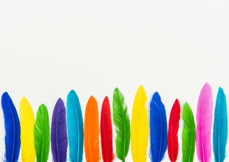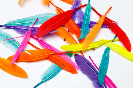 Bright and colourful feathers arranged on a white background