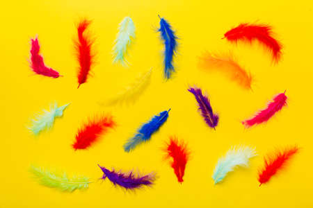Soft colored feathers on yellow background. minimalism. top view. flat lay