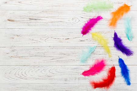 Colorful feather background, top view. Copy space.
