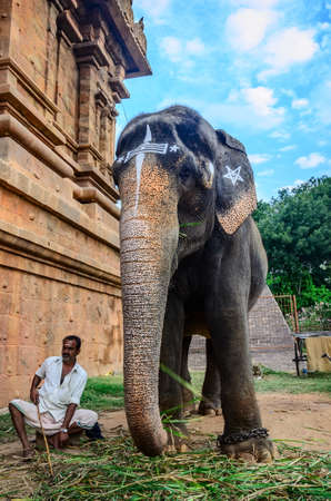 THANJAVOUR, INDIA - FEBRUARY 13: An unidentified man sits at the gate of the Temple Brihadishwara next to an elephant. India, Tamil Nadu, Thanjavour. February 13, 2013