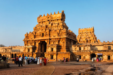 Tanjore, India - March 26, 2011: People visit famous Brihadishwarar Temple in Thanjavur, Tamil Nadu, India one of Great Living Chola Temples UNESCO World Heritage Site and importang religious site