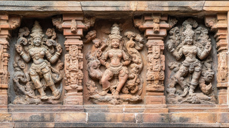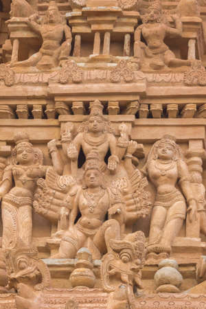 Bas relief ancient sculptures carved on the walls of historical Brihadeeswarar temple in Thanjavur, Tamilnadu. Indian rock art relief carvings of ancient God sculptures in temple walls in Tamilnadu.