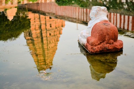Pool with mirror reflection of Virupaksha Hindu temple, Hampi