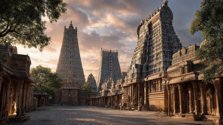 Meenakshi Amman temple in Madurai, Tamil Nadu, India showcases vibrant dravidian architecture with intricate ornamental details, dynamic gopurams, and a lively spiritual ambience that reflects deep cultural devotion and historical legacy, offering a striking visual asset for travel, heritage, and art projects