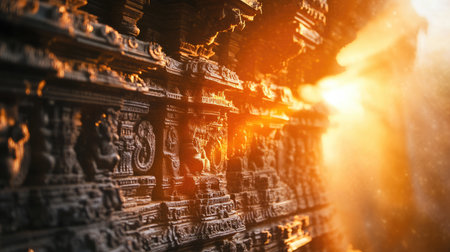 An ancient Indian temple carving glowing under a beam of sunlight.