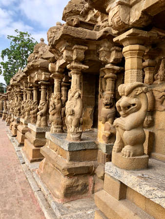 Sandstone sculptures of God and lions are carved prominently as a idols in the ancient kanchi kailasanathar temple in kancheepuram